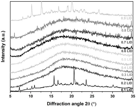 As a first step, the establishment of co-amorphous systems with varying FLB-LID ratios was confirmed by XRPD (Figure 1). It can be seen that anhydrous co-amorphous FLB-LID with mole fractions of LID from 0.2 to 0.8 can be made amorphous at room temperature. Although these ambient temperature measurements cannot be directly correlated with the later DSC and BDS experiments, which were conducted at very low temperatures, the formation of co-amorphous systems was confirmed.