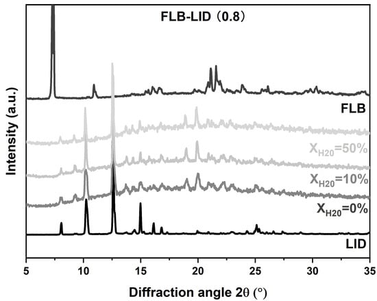 Figure 2. XRPD diffractograms of co-amorphous FLB-LID with XH2O = 0%, 10%, 50% after isothermal partial crystallization, crystalline FLB, and crystalline LID.
