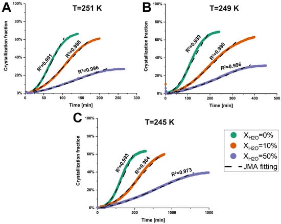 Figure 3. Crystallization fractions of anhydrous and hydrated co-amorphous FLB-LID systems with water-to-drug molar ratios of XH2O = 0%, XH2O = 10%, and XH2O = 50%, as a function of time upon isothermal crystallization at 251 K (A), 249 K (B), and 245 K (C). The JMA fitting results are shown as black dashed lines.