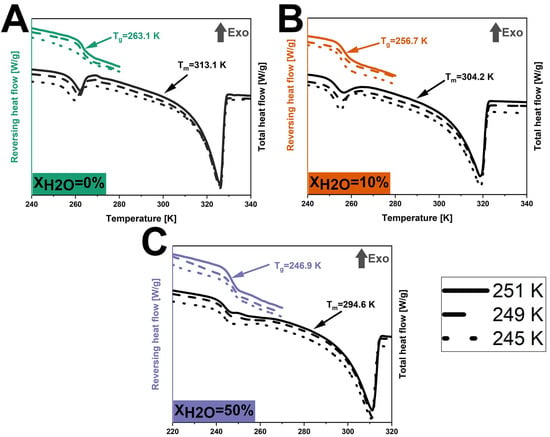 DSC was conducted to compare the thermal transitions between the anhydrous and hydrated systems after isothermal crystallization. After isothermal (partial) crystallization at 245 K, 249 K, and 251 K (Figure 4), all anhydrous co-amorphous FLB-LID systems showed a glass transition at 263.1 K. In a similar manner, at XH2O = 10%, a Tg of 256.7 K was found for all three isothermal conditions, whilst at XH2O = 50%, a Tg of 246.9 K was found for all three conditions. This consistency aligns with the similar crystallization fractions found at various temperatures, as shown in Table 1. The Tg at 263.1 K for the anhydrous co-amorphous FLB-LID system is closer to the Tg of pure FLB (268.0 K) than to the Tg of pure LID (209.8 K) (Figure 4A). This indicates that the remaining amorphous component mainly consisted of amorphous FLB and only a small fraction of amorphous LID. In addition, a single endothermic transition was observed at 313.1 K, attributed to the melting of the crystallized component. This Tm is closer to the Tm of LID (341.6 K) compared to the Tm of FLB (390.2 K), indicating that the crystallized component of the anhydrous system during isothermal crystallization mainly consisted of crystallized LID.