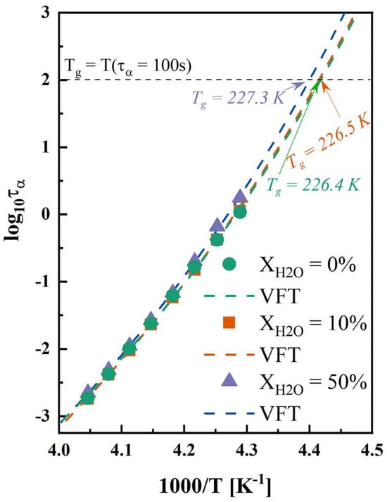 For amorphous drugs and systems, isothermal hold above Tg can facilitate the crystallization process, attributed to the increased α-relaxation compared with the conditions below Tg [54]. Figure S3 shows the dielectric loss spectra of anhydrous and hydrated co-amorphous FLB-LID systems. As shown in Figure 3, the α-relaxation times of anhydrous and hydrated co-amorphous FLB-LID systems exhibited similar temperature dependences. The VFT fit (Equation (5)) was used to describe the temperature evolution of the α-relaxation times of anhydrous and hydrated co-amorphous FLB-LID systems (Figure 5, dashed lines). The VFT fitting parameters are shown in Table S2. The Tgs, as determined by the VFT fit, were recognized at the point where τα reached 100 s. The Tgs of anhydrous and hydrated co-amorphous FLB-LID systems were found to be 226.4 K for XH2O = 0%, 226.5 K for XH2O = 10%, and 227.3 K for XH2O = 50%, in agreement with the Tgs obtained from the DSC measurements. It has been shown that as the temperature increases, the molecular mobility of anhydrous and hydrated co-amorphous FLB-LID systems increases, as indicated by reduced α-relaxation times (τα), corresponding to an increased crystallization complete-time. However, anhydrous and hydrated co-amorphous FLB-LID systems exhibited similar mobility at constant temperatures. Overall, it can be stated that molecular mobility alone cannot explain the isothermal crystallization behavior of the co-amorphous FLB-LID system during hydration.