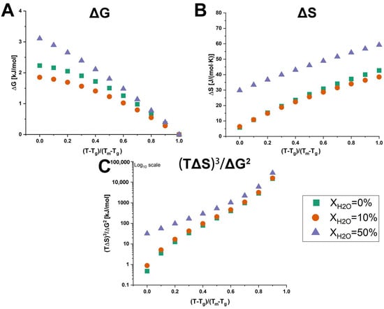 Figure 6. Temperature dependence of ΔG (A), ΔS (B), and (TΔS)3/ΔG2 (C) of anhydrous and hydrated co-amorphous FLB-LID systems with water-to-drug molar ratios of XH2O = 0% (green), XH2O = 10% (orange), and XH2O = 50% (purple).