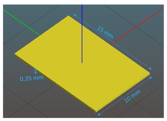 The printing process begins with the designing of a 3D structure in a CAD modeling program [19]. This 3D CAD file is converted into G-code, instructing the 3D printer head on movement, timing, and extrusion. A 3D slicing software (i.e., Slic3r) generates the G-code from the 3D CAD design. Finally, the printer constructs the structure according to the G-code instructions. In this study, Solidworks (Dassault Systèmes, 2018), a CAD program, was used to create the 3D model of the film (see Figure 1). The preliminary design for the film has dimensions of 15 mm in length, 10 mm in height, and 0.35 mm in thickness.
