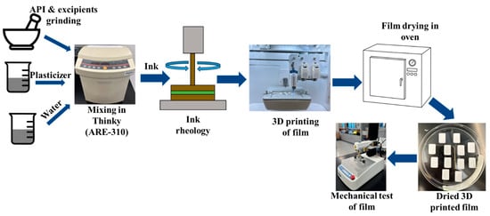Oral thin films (OTFs) have emerged as a promising and prominent dosage form in the pharmaceutical industry, traditionally dominated by tablets and capsules [1]. OTFs are particularly beneficial for patients with swallowing difficulties, such as children, the elderly, and those with dysphagia [2,3]. OTFs also provide other advantages, including more accurate dosing, enhanced oral absorption, improved bioavailability through minimization of drug degradation, better stability, dose tunability, portability, etc. [4]. Three-dimensional (3D) printing has become increasingly important in drug delivery since it offers a safer and more effective method for administering potent therapeutics [5,6]. Recent advancements have expanded 3D printing in oral drug delivery, leading to innovative pharmaceutical dosage forms, including OTFs [7]. 3D printing presents a promising alternative for developing and manufacturing OTFs, overcoming the limitations of traditional techniques such as solvent casting or hot-melt extrusion. Unlike solvent casting, 3D printing allows for more customization of solid dosage forms for end-stage personalization [8,9].