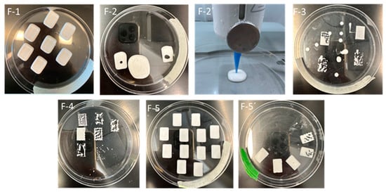 3D films were produced using each ink and the Cellink BioX 3D printer with the following procedure and printer settings: the prepared ink was loaded into a 3 mL cartridge and placed into the printing head. Then, a 410 μm nozzle was attached to the cartridge and positioned in the printer’s printhead. Printing was performed on 100 mm diameter plastic Petri dishes at a printing speed of 10 mm/s, an infill density of 50%, and a printing pressure of 60 kPa. The successfully printed films were dried at 40 °C for 24 hours (for F-1) and 48 hours (for F-5 and F-5’) in an oven (Heratherm OMS60, Thermo Fischer Scientific, Waltham, MA, USA) to evaporate any excess moisture. Films (F-5 and F-5’) containing glycerin required extended drying time. A short drying time results in inadequate water removal and sticky 3D-printed products [46]. It is noted that in this study, an optimization of drying was not performed. Figure 2 illustrates the ink formulation and rheology, the 3D film printing, and subsequent mechanical testing. 3D printing outcomes using different inks are presented in Figure 3.