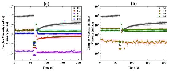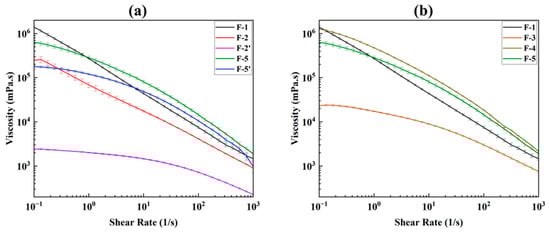 Viscosity profiles comparison for ink formulation (a) F-1, F-2, F-2’, F-5, and F-5’ and (b) F-1, F-3, F-4, and F-5.