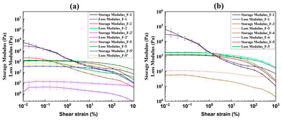 Amplitude sweep curve comparison for ink formulation (a) F-1, F-2, F-2’, F-5, and F-5’ and (b) F-1, F-3, F-4, and F-5.