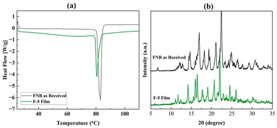 The differential scanning calorimeter (DSC) and X-ray diffraction (XRD) analyses of the film (F-5) and the as-received FNB drug were performed to evaluate FNB crystallinity in the film. A DSC was used to determine the crystallinity and phase transitions (if any) of the FNB drug embedded in the film compared with the as-received FNB powder [79]. The DSC thermogram of FNB (as-received) and dried film is presented in Figure 7a. The phase transition sharp peaks were the melting temperatures of the FNB (as-received) and the embedded FNB in the film. The melting temperature for as-received FNB is 80–81 °C, while the melting temperature of the embedded FNB in film ranges from 80 °C to 82 °C [80]. The DSC results suggested that the embedded FNB in the film did not exhibit any polymorphic phase, and the crystalline nature of FNB was preserved after film formation. Significant crystal defects would result in a substantial reduction in melting temperature, which was not observed. In addition, the embedded FNB peak did not shift compared to the as-received FNB, implying that the embedded FNB did not interact with the film polymers and other additives [79,81]. This further validated the crystalline nature of FNB in film. However, the reduced endothermic peak observed for the film might be due to the dilution effect. Besides the DSC, an XRD analysis of the dried 3D thin film (F-5) was conducted to support whether FNB maintained its crystalline structure after printing. Figure 7b shows the XRD pattern for the as-received FNB powder and the printed F-5 film. The XRD patterns are very similar, indicating that the FNB crystalline structure remains unchanged in the film even after printing and subsequent drying.