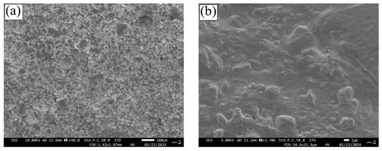 SEM images of F5 film’s surface at (a) 90× magnification and (b) 3700× magnification.