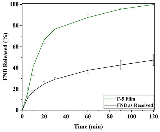 As described in Section 2.6.5, all six films from ink formulation F-5 were analyzed for drug loading, and the results are provided in Table S1. The average drug loading in the films was 44.28% (w/w), with a relative standard deviation (RSD) of 5.62%. The findings suggest that FNB is evenly distributed across the six films printed using the F-5 ink [82]. Dissolution tests were conducted using the basket method to determine the FNB release profile of the F-5 films. The dissolution profiles of F-5 film and as-received FNB are presented in Figure 9. A distinct difference is observed between the two profiles, confirming that FNB dissolves faster in the film than the as-received FNB powder. A complete drug release from the films was achieved within 120 min, whereas, as received, FNB powder dissolved only 47%. A closer look at the F-5 film dissolution profile shows more than 77% dissolve within 30 min. To investigate such a fast release, it is found that the dried film contains SA, PVP, and SSG, where SSG acts as a super disintegrant that aids in the rapid disintegration of the film [82]. SSG has a quick moisture absorption property, resulting in swelling and subsequent expedited breakdown of pharmaceutical dosage; in this case, it is the film [83]. Hence, a faster drug release from the films is likely due to their rapid breakdown or disintegration, which generates more pores and channels, facilitating the drug’s diffusion out of the films [84].