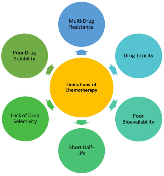 Among the limitations of chemotherapy are the lack of selectivity, toxicity, insufficient drug delivery to the desired site, poor drug solubility, and low bioavailability (Figure 1). In essence, poor drug delivery to the targeted tumor is one of the major drawbacks hampering the positive outcomes of chemotherapy [1,2,4,5,6]. Therefore, a better alternative to treating cancer is a pressing need. Nano-sized drug delivery systems have been widely documented as promising therapeutic tools for combating cancer. Nanocarriers are drug delivery systems with diameters between 1 and 100 nm. Nanocarriers studied in cancer research include nanoliposomes, micelles, dendrimers, nanoparticles, polymer-drug conjugates, and nanocapsules [7]. Nanoliposomes have been explored as effectual systems for drug delivery of anticancer drugs for breast and prostate cancer targeting. Nanoliposomes offer several notable advantages that have captured the interest of biomedical researchers. These include precise drug delivery, a reduction in the toxic effects of the loaded drugs on healthy human cells, and the ability to control and sustain the release of drugs over time. Additionally, nanoliposomes demonstrate excellent biocompatibility and enhance the overall therapeutic effectiveness of treatments. The other interesting advantages of nanoliposomes include prolonged drug clearance and circulation half-life [8,9].