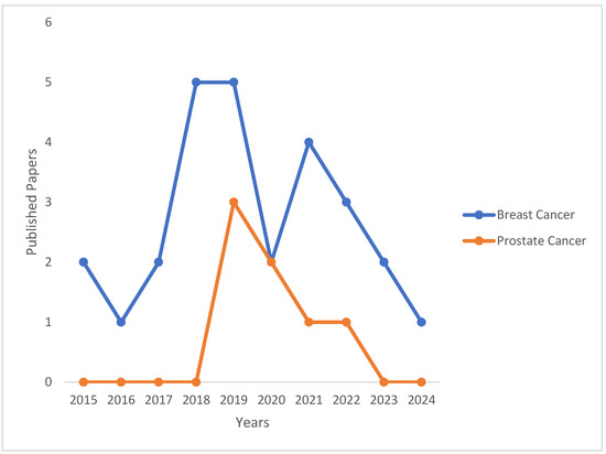 Nanoliposomes can be functionalized with polymers (i.e., natural or synthetic polymers) to improve their therapeutic outcomes further. The natural polymers that can be utilized for the functionalization of nanoliposomes are gelatin, cellulose, chitosan, hyaluronic acid, etc. [10,11,12]. Synthetic polymers include (poly-ethylene glycol) (PEG), PLGA, Poly(2-ethyl-2-oxazoline) (PEtOx), poly (ε-caprolactone), etc. [13,14]. PEG has been explored extensively for synthesizing liposomes to deliver bioactive agents for cancer targeting. The technology of PEGylation (PEGylation) was first introduced in the late 1960s by Frank Davis to avoid immunogenic reactions and enzyme attacks of a recombinant protein drug [15]. Presently, PEG is approved by the US Food and Drug Administration (FDA) as a carrier in numerous formulations, including pharmaceuticals. Incorporating PEGylated nanoliposomes composed of a longer PEG chain reduces pH responsiveness, though the cell uptake toward the high PEG molecules can be low [16]. This review manuscript discusses PEGylated nanoliposomes, which are loaded with anticancer drugs, for treating breast and prostate cancer. The number of publications per year on PEGylated nanoliposomes for breast and prostate cancer therapy is shown in the line graph below (Figure 2).