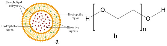 (a) Nanoliposomes encapsulated with bioactive agents (b) Molecular structure of PEG.