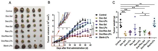 (A) Photographs of tumors, (B) tumor volume changes, (C) tumor weight changes on PC3 bearing male Balb/c nude mice after intravenous injection with different formulations. p < 0.05, ** p < 0.01, a statistically significant difference compared with the control group; # p < 0.05, ## p < 0.01, a statistically significant difference contrasted with Doc/Res-LPs group. ns; not significant. Data were given as mean ± SD (n = 5). Reproduced with copyright permission from Elsevier [62].