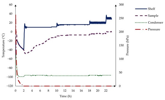 The freeze-drying process consists of a 2 h freezing stage at −40 °C, followed by 8 h drying at 10 °C, 8 h at 15 °C, 4 h at 20 °C, and 2 h at 30 °C in a vacuum.