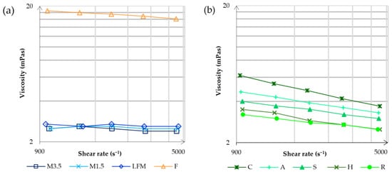 The viscosity measurements by the Fluidicam™ RHEO microfluidic viscometer. The results of the dairy milk and formula are shown in (a), and then the results of the PBDs are shown in (b). LFM (lactose-free milk 1.5%), M3.5 (Mizo milk 3.5%), M1.5 (Mizo milk 1.5%), F (formula: Nutricia Nutridrink Diacare Vanilla flavour), S (soya), H (hazelnut), R (rice), C (coconut), and A (almond).