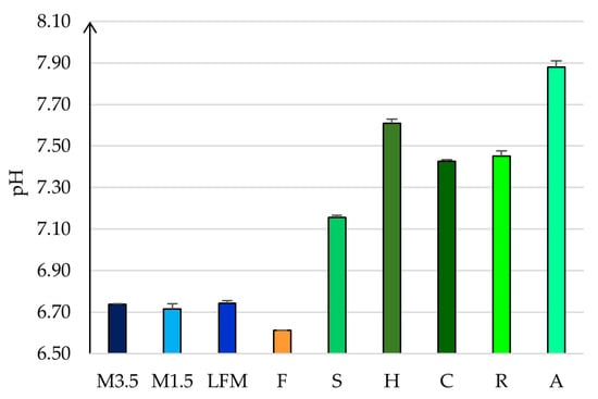 The measured pH values. LFM (lactose-free milk 1.5%), M3.5 (Mizo milk 3.5%), M1.5 (Mizo milk 1.5%), F (formula: Nutricia Nutridrink Diacare Vanilla flavour), S (soya), H (hazelnut), R (rice), C (coconut), and A (almond).