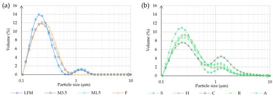Particle size analysis result. (a) Shows the results of the different kinds of milk and the formula. (b) Shows the results of the PBD samples. LFM (lactose-free milk 1.5%), M3.5 (Mizo milk 3.5%), M1.5 (Mizo milk 1.5%), F (formula: Nutricia Nutridrink Diacare Vanilla flavour), S (soya), H (hazelnut), R (rice), C (coconut), and A (almond).
