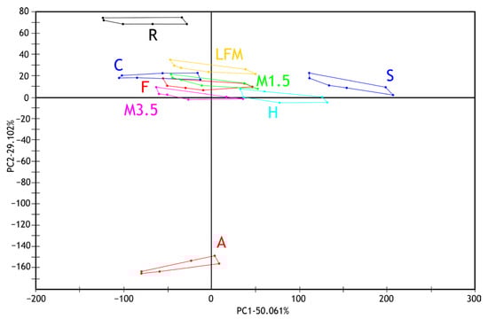 PCA results (PC1-PC2) of electronic tongue measurements of milk and PBD solution samples tested. LFM (lactose-free milk 1.5%), M3.5 (Mizo milk 3.5%), M1.5 (Mizo milk 1.5%), F (formula: Nutricia Nutridrink Diacare Vanilla flavour), S (soya), H (hazelnut), R (rice), C (coconut), and A (almond).