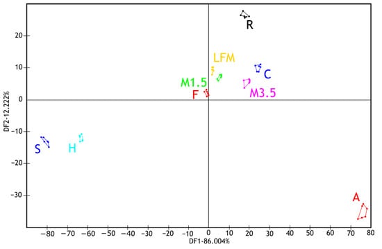 LDA results of the electronic tongue measurements for the tested dairy milk and PBD solutions. LFM (lactose-free milk 1.5%), M3.5 (Mizo milk 3.5%), M1.5 (Mizo milk 1.5%), F (formula: Nutricia Nutridrink Diacare Vanilla flavour), S (soya), H (hazelnut), R (rice), C (coconut), and A (almond).