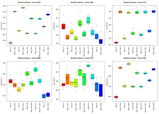 Figure 8a shows the mean values of the electronic tongue sensors, broken down by sample, along with their standard deviations. Similar to the observations from the boxplot analysis, the mean sensor signal results, illustrated with error bars, clearly demonstrate that significant differences were observed between most samples, even at the sensor level.