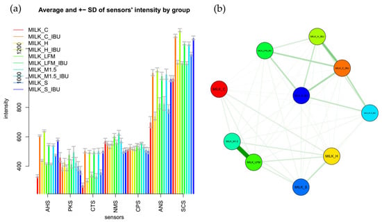 Mean sensor values of the electronic tongue for the tested dairy milk and plant-based drink solutions (a) shown per sample; (b) comparative chart based on the multidimensional group distances of the tested samples. LFM (lactose-free milk 1.5%), M3.M1.5 (Mizo milk 1.5%), S (soya), H (hazelnut), C (coconut), and and “_IBU” means ibuprofen-containing samples. AHS (Average Histogram Signal), PKS (Peak Signal), CTS (Computed Taste Score), NMS (Normalized Measurement Signal), CPS (Cycles Per Second), ANS (Average Normalized Signal), SCS (Sensor Contribution Score).