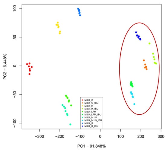 The principal component analysis (PCA) results of the electronic tongue measurements for the tested dairy milk and plant-based drink solutions are shown: PC1-PC2 score plot. LFM (lactose-free milk 1.5%), M1.5 (Mizo milk 1.5%), S (soya), H (hazelnut), C (coconut), an the red circle and “_IBU” means ibuprofen-containing samples.
