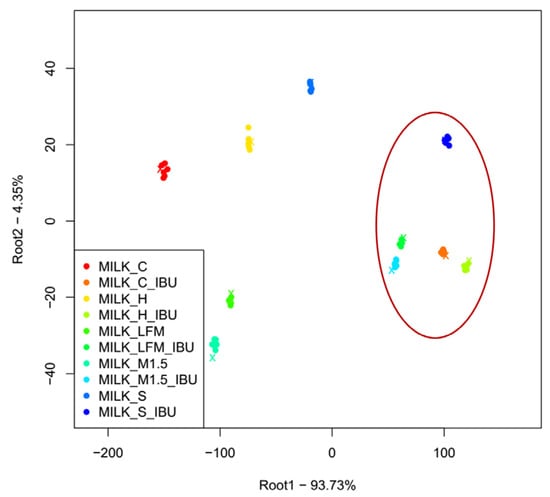 The LDA results of the electronic tongue measurements for the tested milk and plant-based drink solutions. (Lactose-free milk 1.5%), M1.5 (Mizo milk 1.5%), S (soya), H (hazelnut), C (coconut), and); the red circle and “_IBU” means ibuprofen-containing samples.