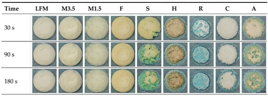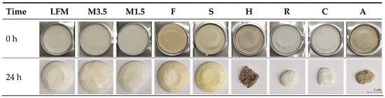 Structural change due to environmental factors (26 ± 2 °C, 60 ± 5% Rh). LFM (lactose-free milk 1.5%), M3.5 (Mizo milk 3.5%), M1.5 (Mizo milk 1.5%), F (Formula: Nutricia Nutridrink Diacare Vanilla flavour), S (soya), H (hazelnut), R (rice), C (coconut), and A (almond).