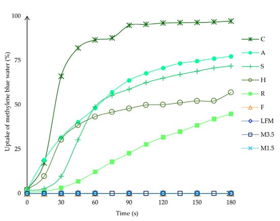 The uptake of methylene blue water. LFM (lactose-free milk 1.5%), M3.5 (Mizo milk 3.5%), M1.5 (Mizo milk 1.5%), F (formula: Nutricia Nutridrink Diacare Vanilla flavour), S (soya), H (hazelnut), R (rice), C (coconut), and A (almond).
