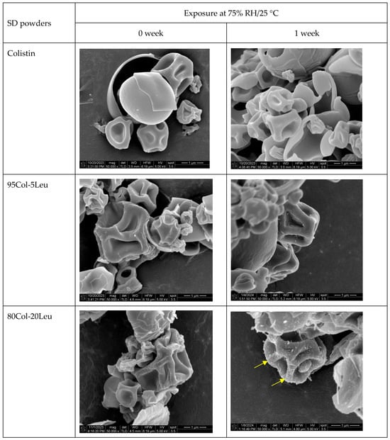 Figure 2 shows the representative particle morphology of the SD formulations before and after exposure to 75% RH for a week. The addition of leucine or trileucine in the formulations showed a slight increase in surface corrugation as compared with SD colistin (0 week in Figure 2). After one-week exposure at 75% RH, the surface of Col-Leu powders showed morphology change indicated by the yellow arrows, whereas SEM images did not show any difference in the SD Col-Trileu powders or SD colistin powder. The morphology changes in the SD Col-Leu formulations were hypothesized to be leucine crystals, based on a previous study where they observed a similar morphology change on the SD particle surface containing leucine after moisture absorption [20].