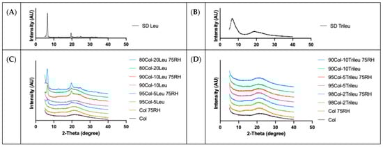 X-ray powder diffraction patterns of the SD formulations: (A) SD leucine, (B) SD trileucine, (C) SD colistin and SD Col-Leu formulations before and after one-week exposure at 75% RH, and (D) SD colistin and SD Col-Trileu formulations before and after one-week exposure at 75% RH.