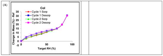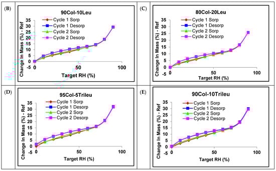 Characteristics of the dynamic vapor sorption over two Sorp-Desorp cycles for the SD formulations: (A) SD colistin, (B) 90Col-10Leu, (C) 80Col-20Leu, (D) 95Col-5Trileu, and (E) 90Col-10Trileu.
