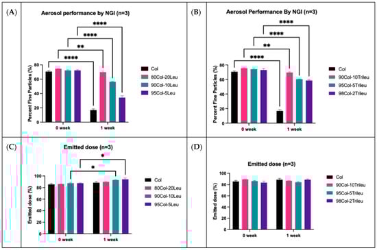 Summary of the fine particle fraction (FPF) and emitted dose as measured by NGI for the SD formulations before and after one-week exposure at 75% RH (mean ± SD, n = 3; * p < 0.05, ** p < 0.01, **** p < 0.0001, assessed by two-way ANOVA multiple comparisons using GraphPad Prism Version 10.0): (A) FPF of SD colistin and SD Col-Leu powders. (B) FPF of SD colistin and SD Col-Trileu powders. (C) Emitted dose of SD colistin and SD Col-Leu powders. (D) Emitted dose of SD colistin and SD Col-Trileu powders.