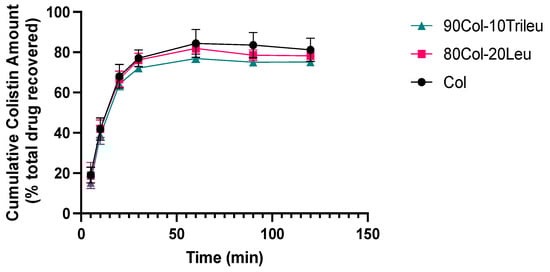 Based on the results of in vitro aerosol performance, 90Col-10Trileu and 80Col-20Leu were further evaluated regarding in vitro dissolution as compared with the SD colistin due to their acceptable moisture protection for the aerosol performance. In Figure 6, the dissolution profile did not exhibit any statistically significant difference among these formulations, suggesting that surface enrichment of leucine or trileucine did not affect in vitro dissolution of colistin. However, it should be noted that in vitro dissolution behavior may not fully represent in vivo dissolution profiles of inhalation formulations.