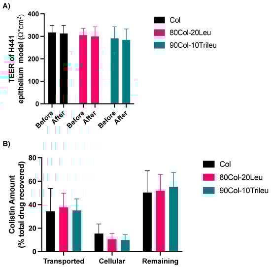 In vitro cell transport: (A) TEER values of the H441 epithelium model (mean ± SD, n = 18). (B) The amount of colistin relative to the total recovered drug among the three chambers (mean ± SD, n = 20).