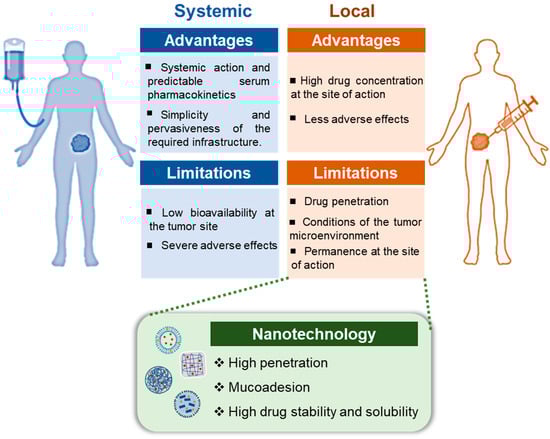 Several studies have demonstrated the benefits of local treatment for various types of cancer [8,9,10,11,12,13]. However, the scope of these studies is limited to a single type of cancer or a specific nanostructure. Additionally, some these studies focus on immunotherapy, while others do not address the application of nanotechnology. Therefore, the objective of this narrative review is to highlight the potential of nanostructured formulations for local cancer treatment, including bladder, breast, colon, lung, oral, and skin cancers. Illustrative examples are provided, and the advantages and challenges associated with this approach are discussed.