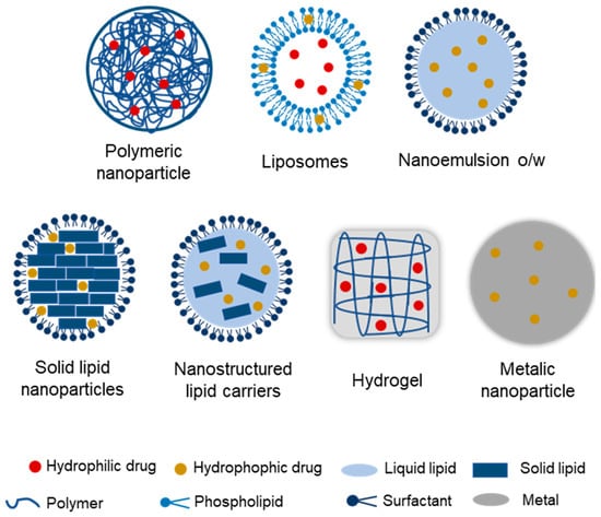 Polymeric nanoparticles are systems in which the active compound is entrapped within or adsorbed onto the polymeric core (natural or synthetic), comprising nanocapsules and nanospheres, respectively [28]. Liposomes, nanoemulsions, solid lipid nanoparticles, and nanostructured lipid carriers are examples of lipid-based nanocarriers. Liposomes are spherical lipid vesicles composed of one or more lipid bilayers with a hydrophilic core [29]. Nanoemulsions are defined as fine water-in-oil (w/o) and oil-in-water (o/w) dispersions of two immiscible fluids [25]. Solid lipid nanoparticles are lipid emulsions in which the liquid lipid (oil) has been substituted by a solid lipid [21]. Nanostructured lipid carriers in turn contain a lipid mixture consisting of both solid and liquid lipids in their core [30]. Nanocomposite hydrogels are defined as hybrid materials comprising three-dimensional polymer networks and additional elements that confer enhanced elasticity and strength [31].