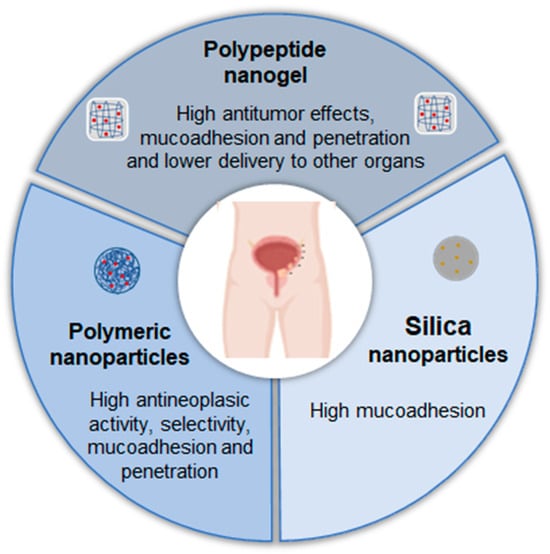 The local administration of bladder cancer treatment can be performed via intravesical drug delivery, which is the direct instillation of medicinal drugs into the bladder through a catheter. This approach offers significant advantages over conventional drug delivery systems for drug administration, as it enhances efficacy while circumventing systemic off-target side effects [32]. Nevertheless, this method continues to exhibit limitations associated with the physiology of the urinary bladder. These limitations include the difficulty of maintaining optimal drug concentrations due to regular voiding and limited penetration that result from the poor permeability of the urothelium [33]. The aforementioned challenges can be overcome by encapsulating drugs in nanoformulations [11,33].