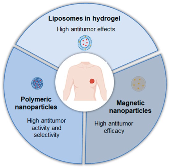Breast cancer is classified into immunohistochemical subtypes based on the presence or absence of estrogen, progesterone, and human epidermal growth factor receptors [43]. Given its heterogeneity, management strategies must consider the specific subtype of the disease. Recently, innovative drug delivery strategies, such as nanostructured systems, have shown promise for enhancing local treatment. These approaches include intraductal administration or targeting drugs to the breast, offering potential benefits such as prolonged tissue retention, improved targeting and selectivity, increased cytotoxicity, and reduced administration frequency [44]. In this context, some progress has already been made to improve the local treatment of breast cancer (Table 2).