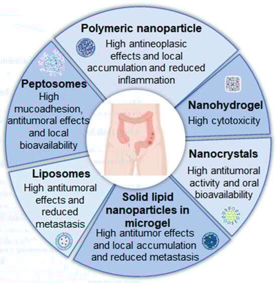 Colorectal cancer is frequently classified based on the site of origin: colon cancer, rectal cancer, and rectosigmoid junction cancer [57,58]. The majority of cases are adenocarcinomas, which originate from the glandular cells of the intestinal epithelium [59]. In an attempt to address these forms of colorectal cancer, nanostructured formulations are being developed for local treatment (Table 3).