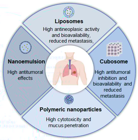 In summary, nanostructured formulations can also be a promising option for the local treatment of lung cancer, offering several advantages in efficacy (Figure 6).