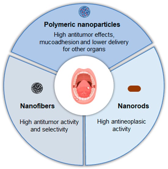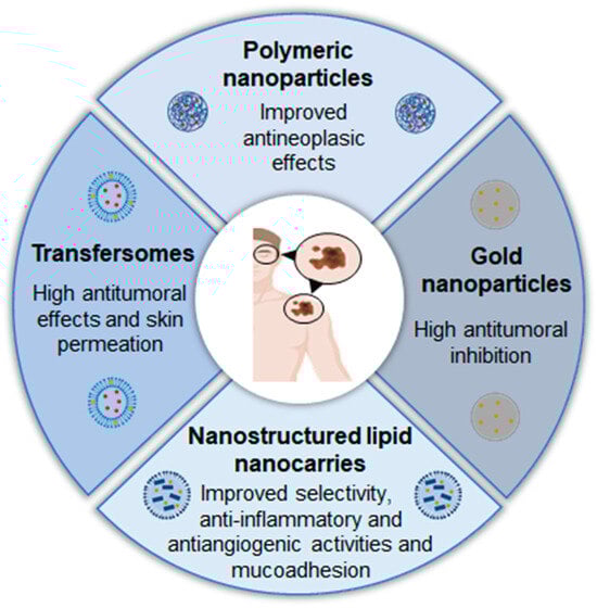 Oral cancer and melanoma can also be locally treated via the topical administration of the drug, as the nanocarriers are an important approach to improve retention at the application site (mucoadhesion) and the penetration into the epithelium [8,34].