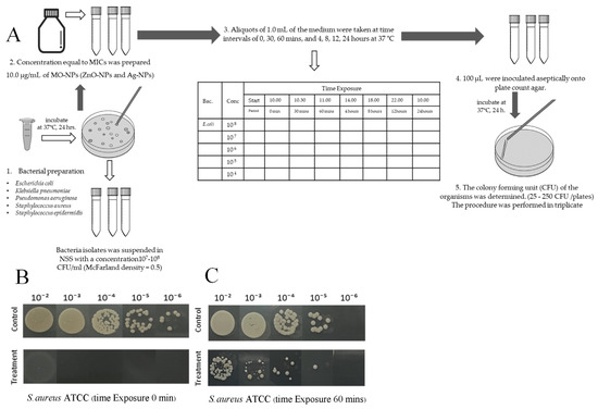 Time-dependent killing capacities of the ZnO-NPs were determined by the method described by Appiah [24] with some modification. In brief, the bacterial suspension was adjusted to a concentration of 105–106 CFU/mL in Muller–Hinton broth (MHB, Oxoid, Thermo ScientificTM, England) containing ZnO-NPs at a concentration of 10.0 mg/mL based on previous antimicrobial activities, and time exposed for 0, 30, and 60 min and 4, 8, 12, and 24 h at 37 °C. Following each exposure period, the samples were serially diluted 10-fold in phosphate-buffered saline (PBS, HimediaTM, India), and 100 µL of each dilution was aseptically inoculated onto the standard plate count agar (PCA, Oxoid, Thermo ScientificTM, England) using the drop plate technique. The plate with the lowest dilution showing a countable number of bacterial colonies (25–250 CFU per inoculation) was selected for enumeration. The average CFU count from the triplicate plates was calculated (Figure 2).