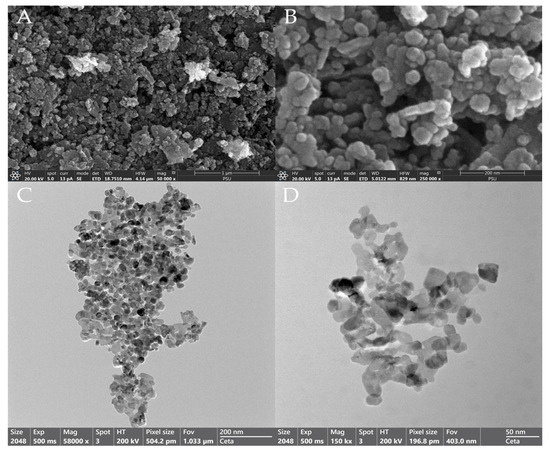 Scanning (A) bar 1 µm; (B) bar 200 nm and transmission electron microscopy (C) bar 200 nm; (D) bar 50 nm images of the ZnO-NPs.