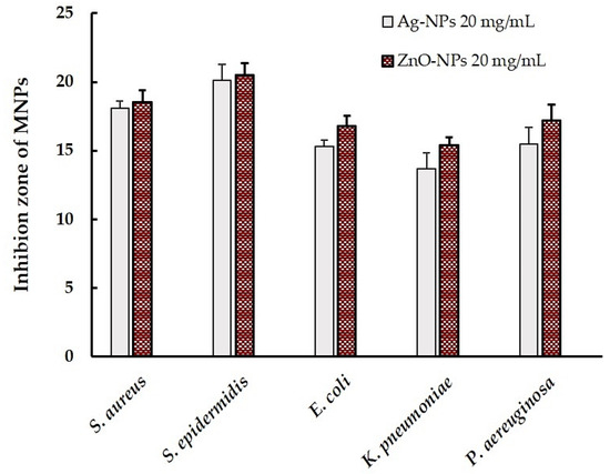 The agar well diffusion method described by Balouiri [22] was used to determine the antibacterial activity of MONPs. Five strains of S. aureus, S. epidermidis, E. coli, P. aeruginosa, and K. pneumoniae, along with reference strains of these bacteria, including S. aureus ATCC25923, S. epidermidis ATCC12228, E. coli ATCC25922, and P. aeruginosa ATCC27853, were used. The colony of each tested bacteria was suspended in a 0.85% normal saline solution and adjusted to 107–108 CFU/mL (McFarland density = 0.5). The bacterial suspensions were then spread onto Mueller–Hinton agar (MHA, HimediaTM, Thane, India) with a sterile cotton swab. Wells were subsequently created using a sterile cork-borer (6 mm in diameter). After that, 40 µL of the ZnO-NPs solution and Ag-NPs as a control at the same concentration (20.0 mg/mL) were added and incubated at 37 °C for 18 to 24 h. The antimicrobial activity of both metallic nanoparticle solutions was determined by measuring the zone of inhibition with a vernier caliper. The study was performed in triplicate.
