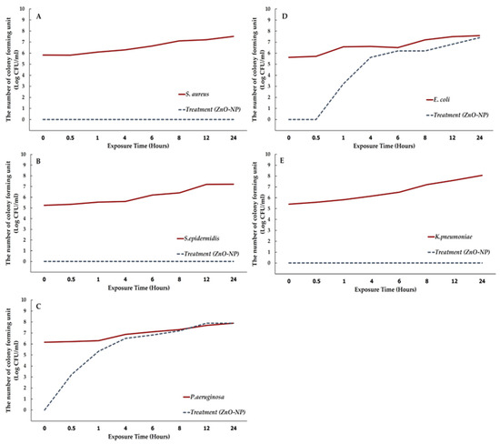 The time-kill kinetic profiles of the ZnO-NPs at a concentration of 10.0 mg/mL against bacterial strains, including S. aureus (A), S. epidermidis (B), P. aeruginosa (C), E. coli (D), and K. pneumoniae (E).
