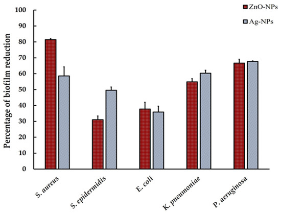 The results of the present study demonstrated that the ZnO-NPs and Ag-NPs acted as antibiofilm agents in all of the tested strains. A previous study explained that the negative charge of carboxylic acid, residual phosphate of uronic acid, or metal-bound pyruvate, which are components of the biofilm matrix, interact with positively charged metal ions (Zn2+ or Ag+) via electrostatic forces, resulting in cell death [38,39,40]. Once the nanoparticles reach the biofilm boundary, they penetrate deep into the biofilm matrix and distribute through these pore spaces. In comparison to the ZnO-NPs, the Ag-NPs demonstrated more potent antibiofilm activity against the strong biofilm formers S. aureus and S. epidermidis. This can be explained by the smaller size of Ag-NPs, which are more prone to interact with the biofilm matrix due to their larger surface area [41].