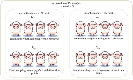 The venom-treated animals are divided into two groups, according to the route of antivenom administration. In one group (n = 8), antivenom is administered by i.m. bolus. In another group (n = 8), antivenom is administered by i.v. infusion over 30 min. In each group, half of the animals are used for lymph sampling (Li.m. and Li.v. groups). The other half are used for blood sampling (Si.m. and Si.v. groups).