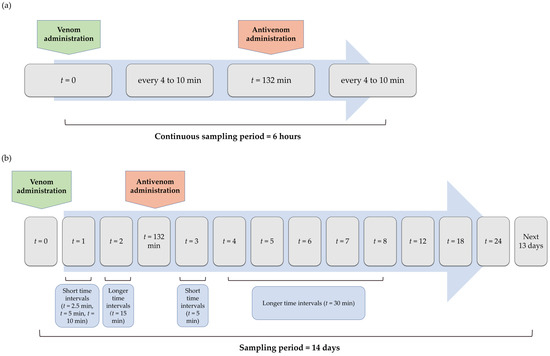 Protocol for lymph (a) and blood sampling (b) in envenomed and antivenom-treated sheep.